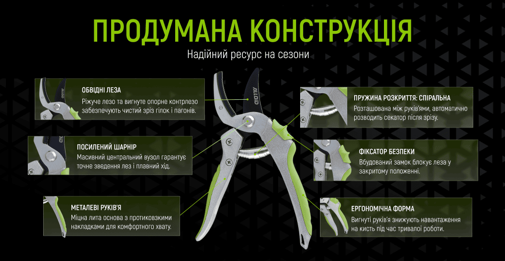 - Особливості: легкий і зручний, забезпечує точний зріз, комфортне утримання навіть при тривалій роботі