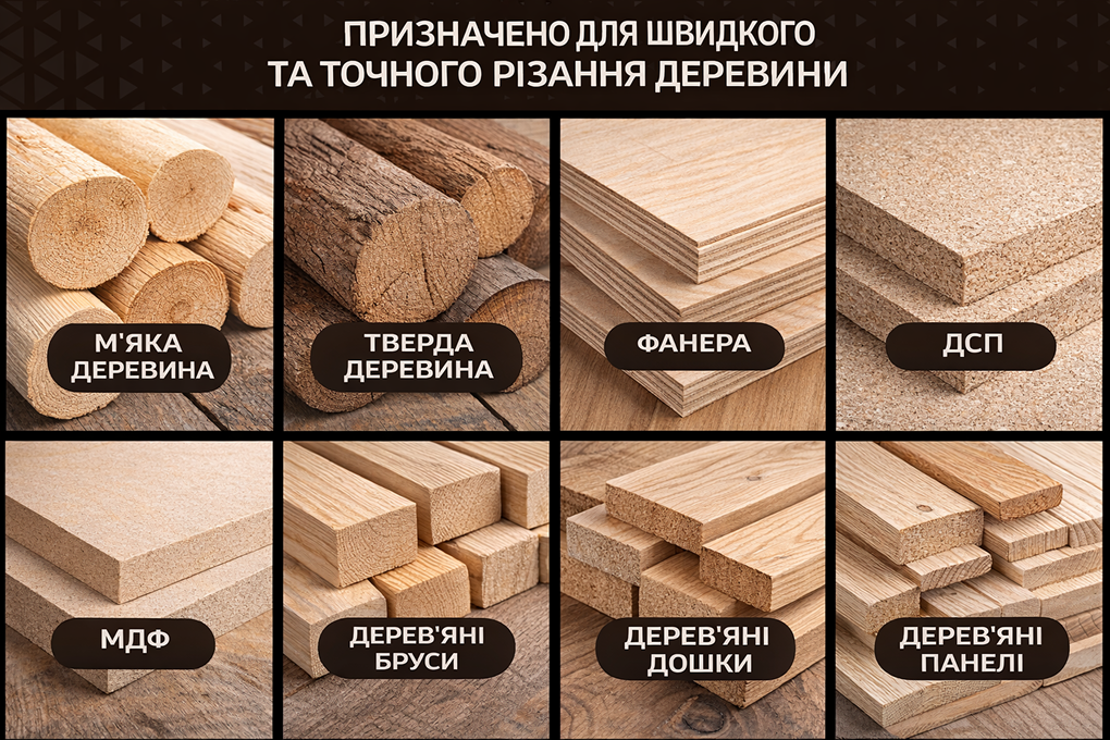 • Тверда деревина — стабільна робота навіть при щільній структурі матеріалу